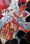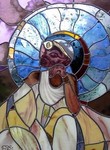 2007Tiffany-techniek in combinatie met glas-in-lood. Gekleurd mondgeblazen antiekglas met beschilderd vensterglas. Metalen frame van 2mmx12mm, ringen en krullen. Niet te zien op de foto. Afbeeldingen wel verkrijgbaar op aanvraag